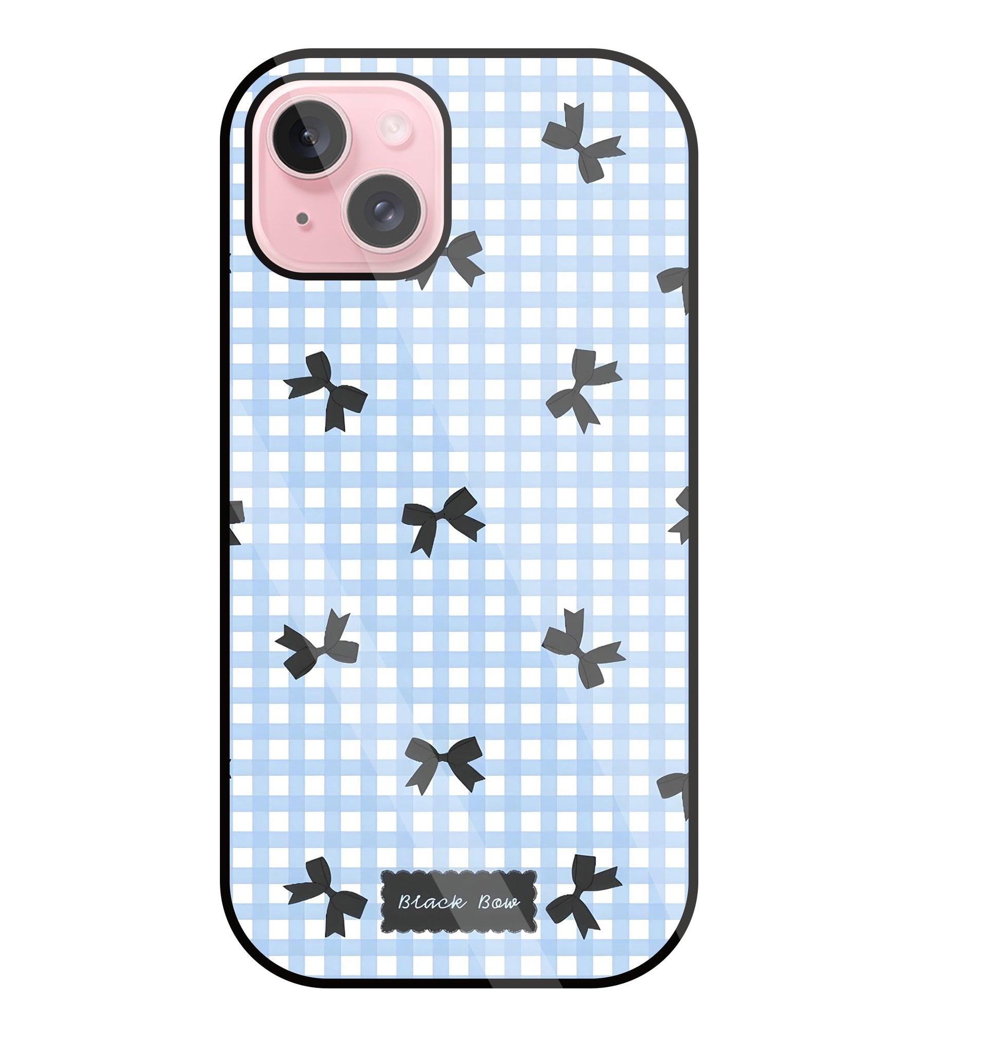 Black Ribbon With Check Pattern Glass Case For Apple iPhone 15 Plus