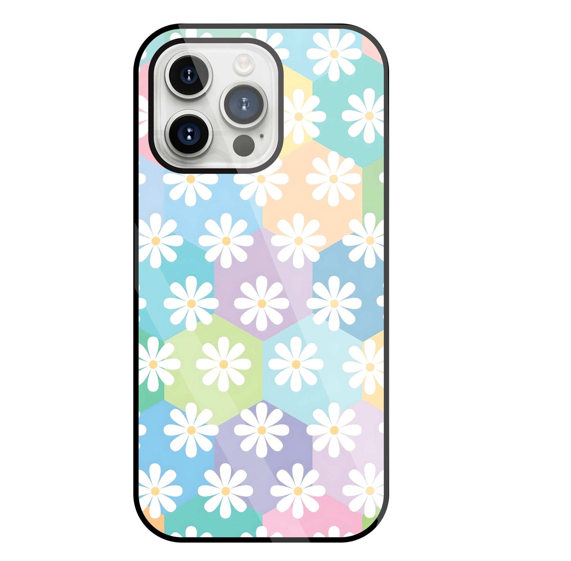 Hexagon Daisy Flower Glass Case For Apple iPhone 15 Pro Max