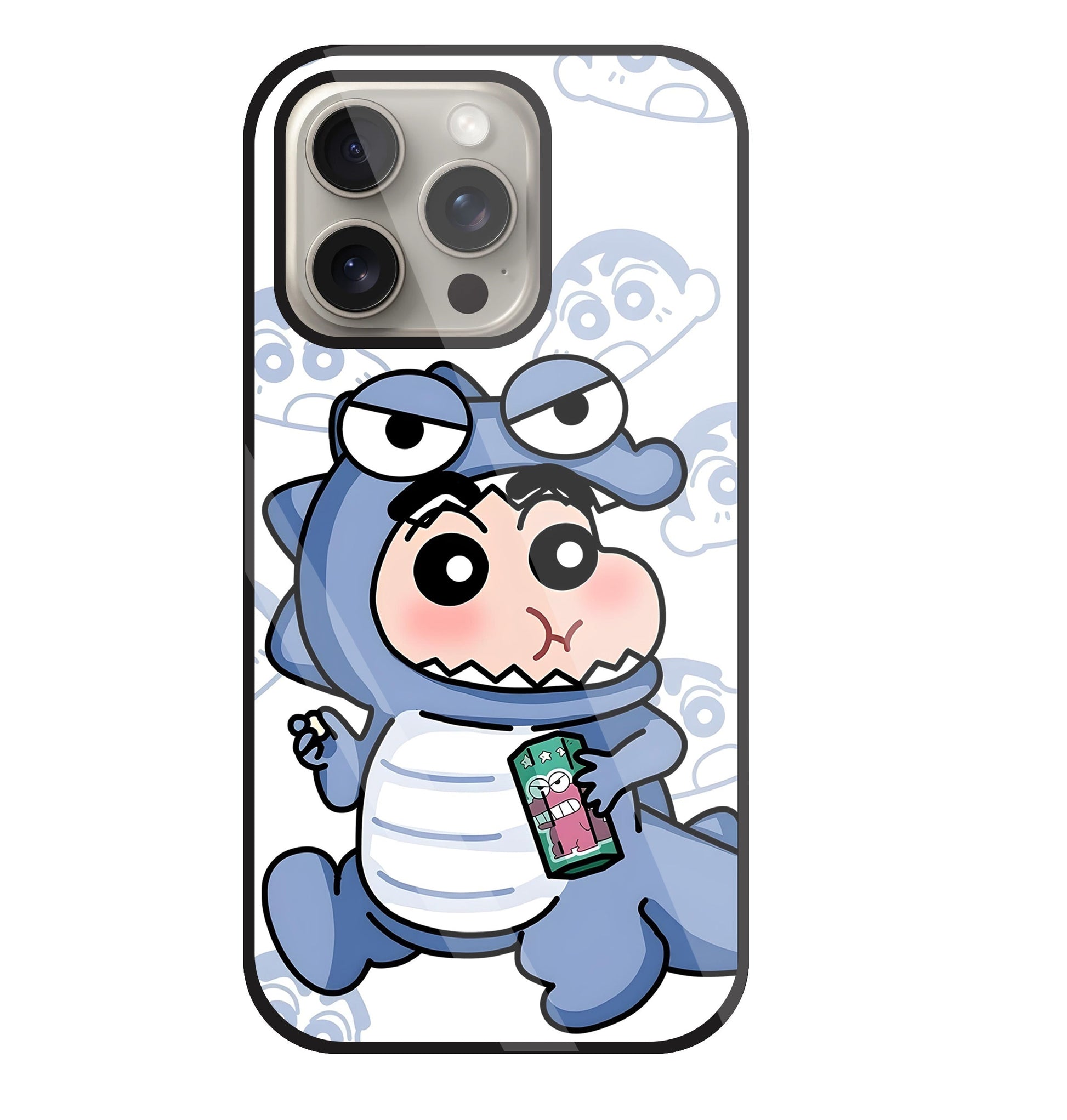 Shinchan Blue Dino Glass Case For Apple iPhone 15 Pro